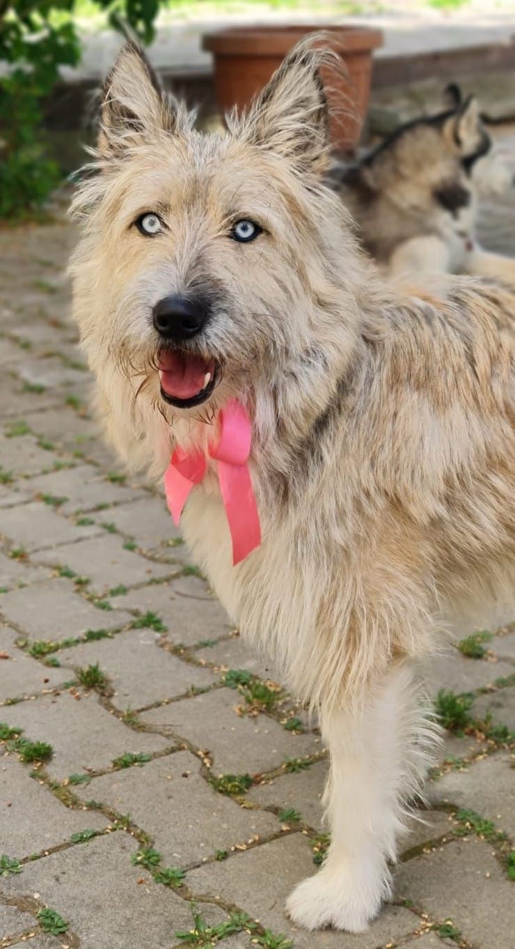 Herausgekommen ist Harta, diese wunderschöne Hündin mit Augen so blau wie Aquamarin und lustigen Steh-Ohren!