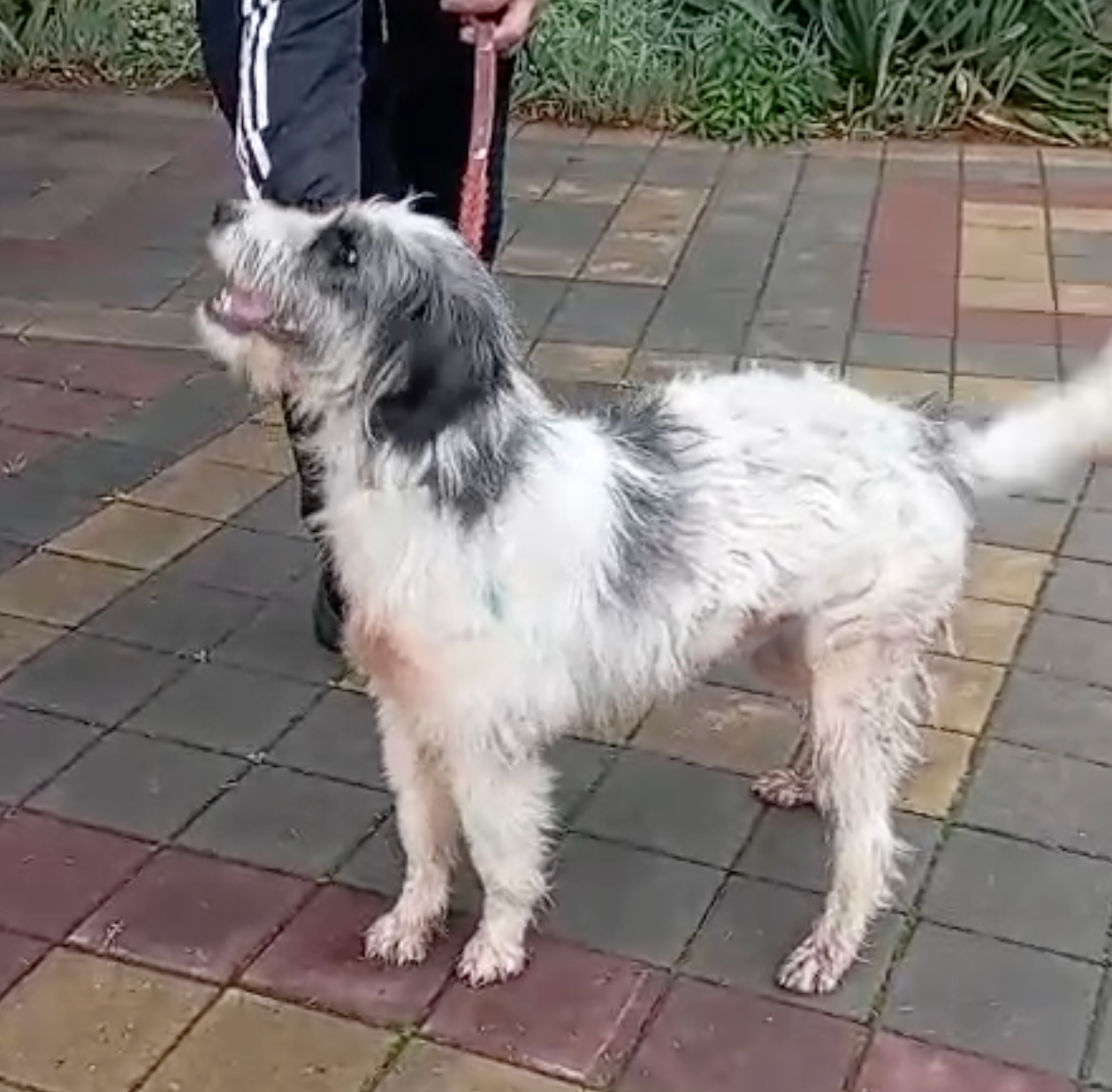 Dieser rührende junge Rüde ist gezeichnet fürs Leben, aber voller Hoffnung und Neugier auf das, was kommt.